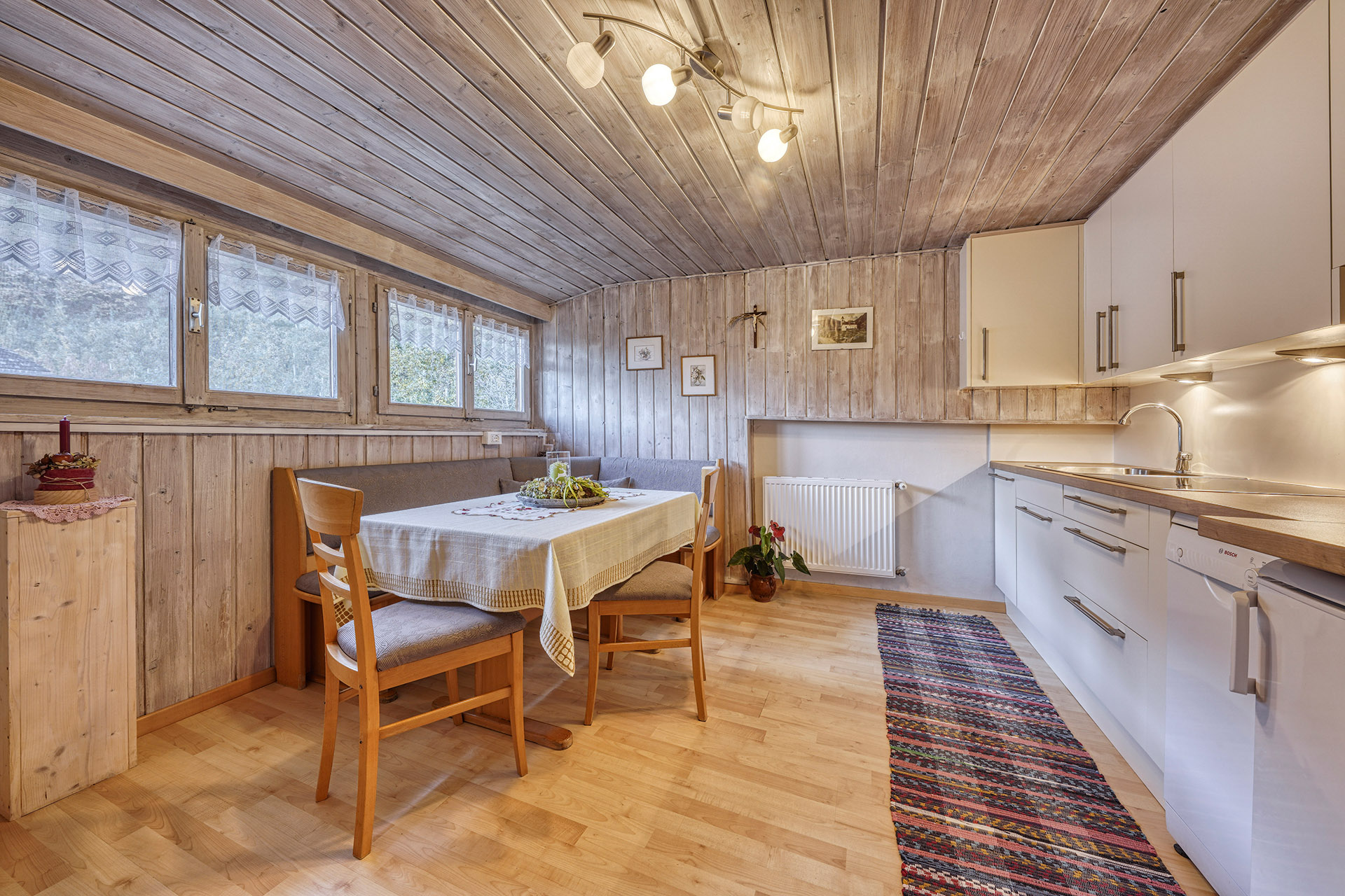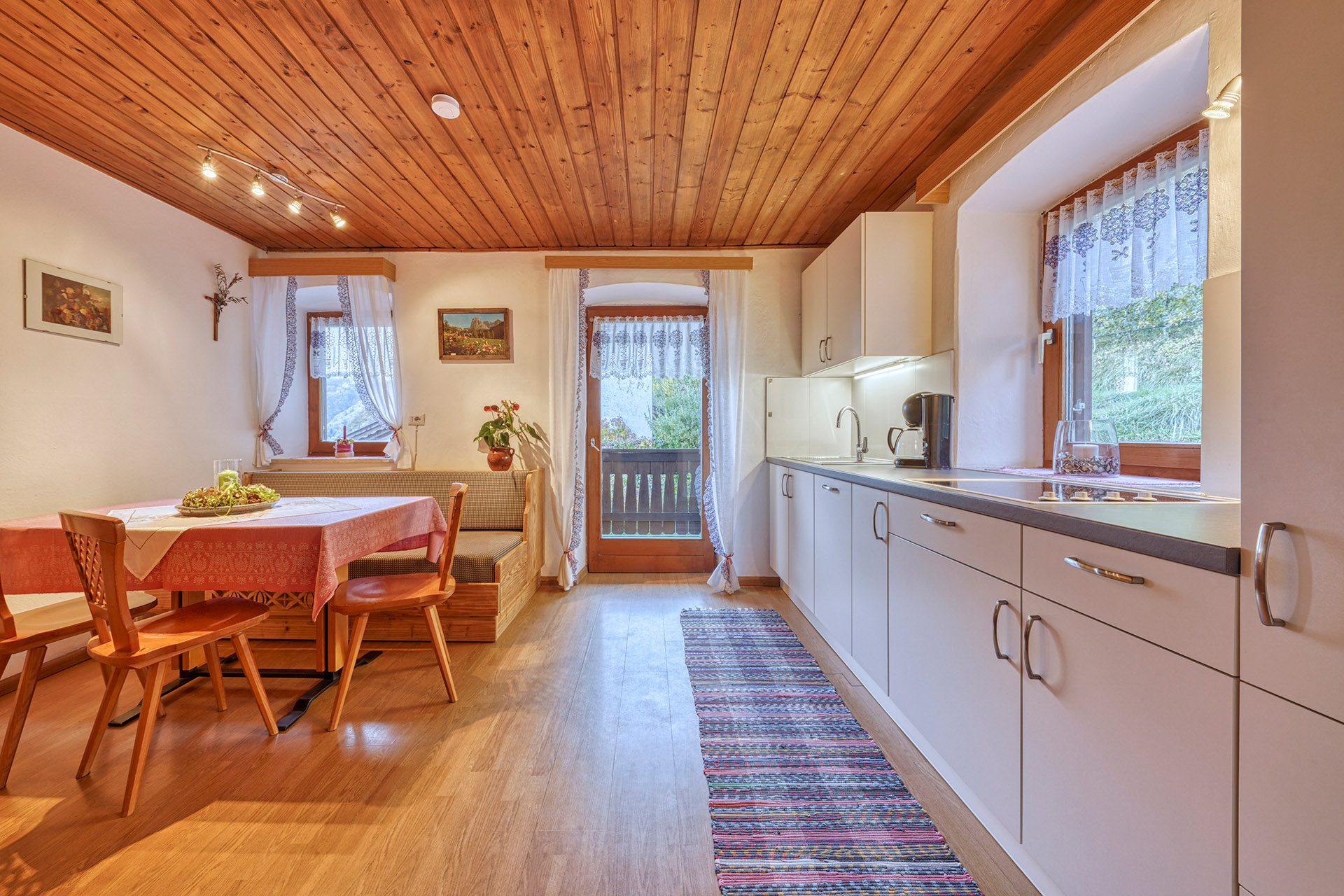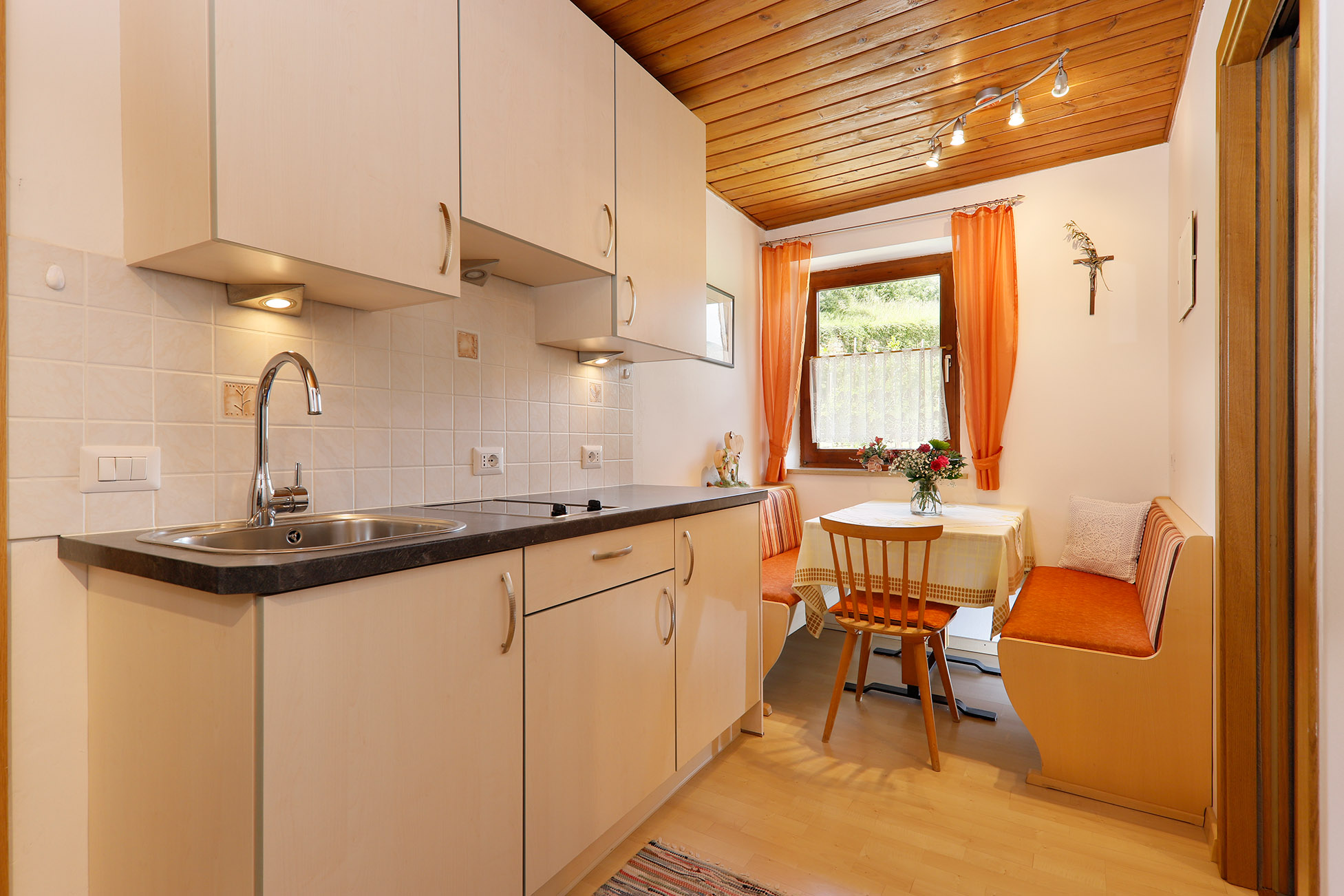 Kühlschrank, Kaffeemaschine, Wasserkocher und Toaster. Die Wohnungen Rosengarten und Etschblick verfügen zusätzlich über einen Geschirrspüler.