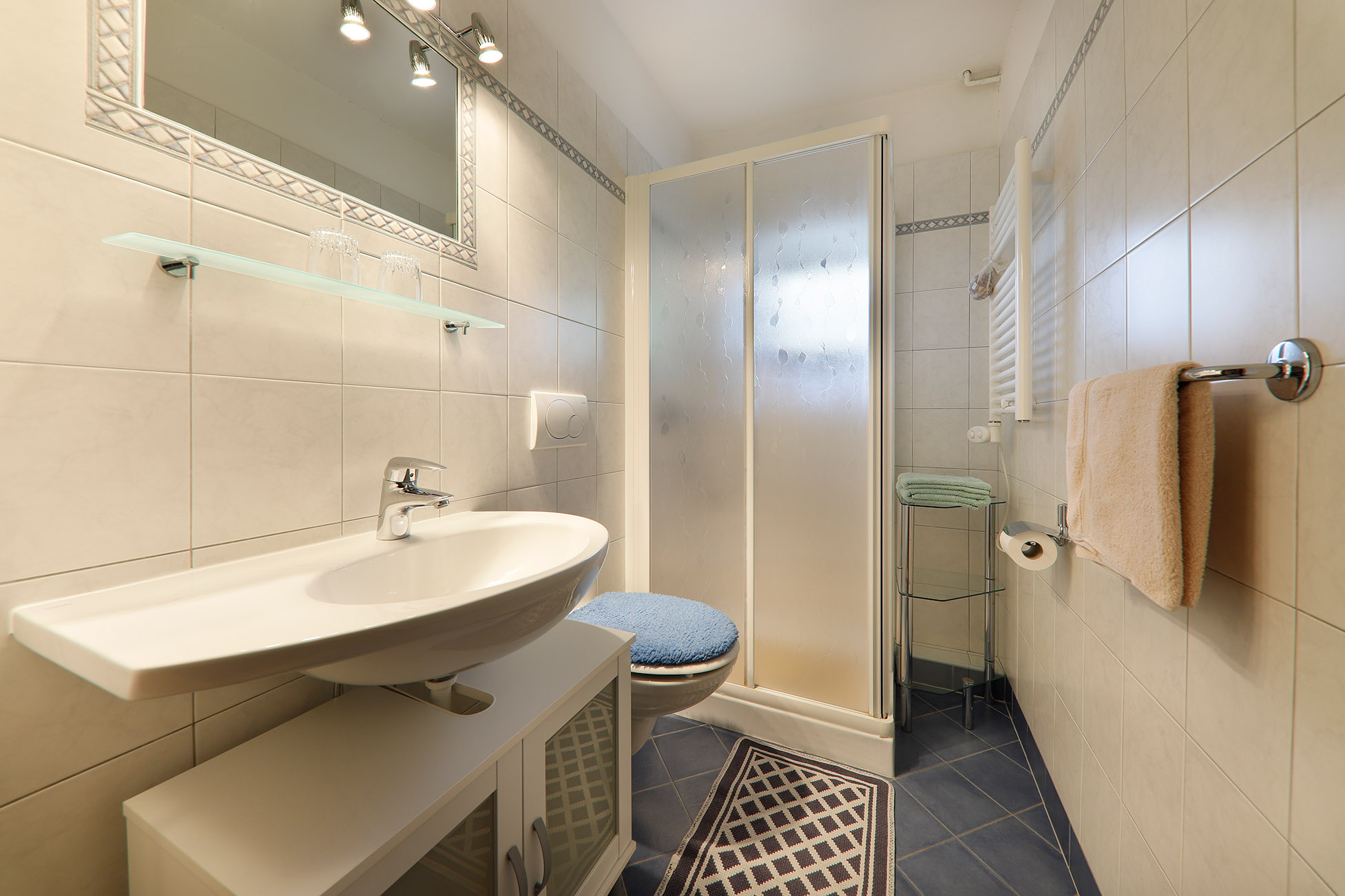 Helle Badezimmer mit Dusche/WC. Dank moderner Heizung ist es bei uns zu jeder Jahreszeit behaglich warm.