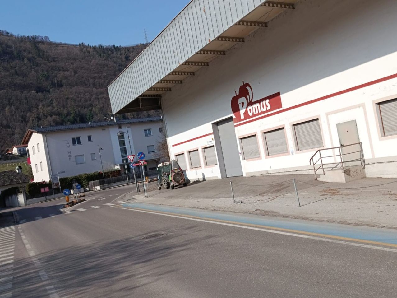 ...und fahren bis zur kleinenVerkehrsinsel (rechts befindet sich das Obstmagazin "POMUS"). Dort biegen Sie links in die Schnatterpeckstraße und fahren Richtung Niederlana weiter...
