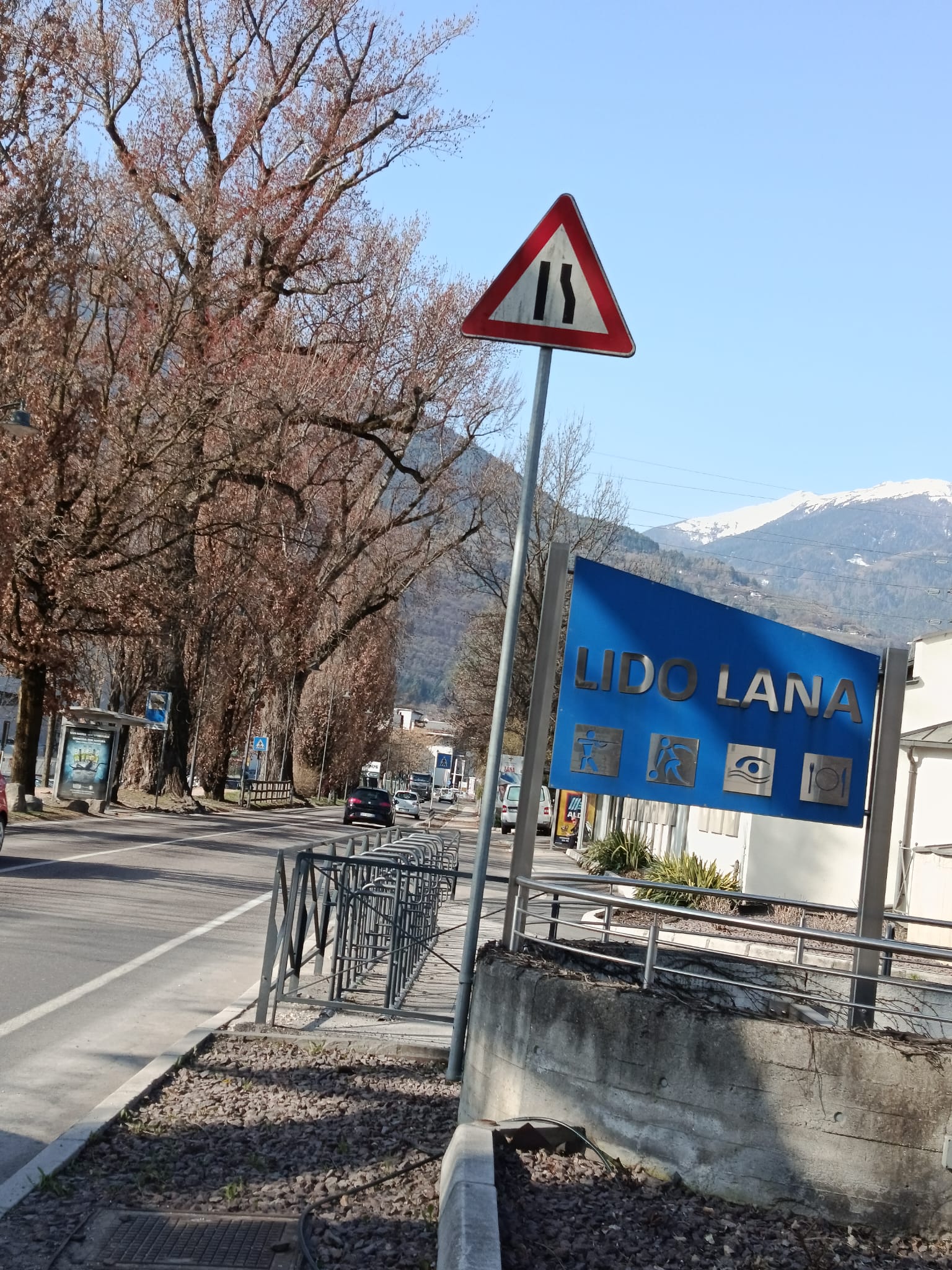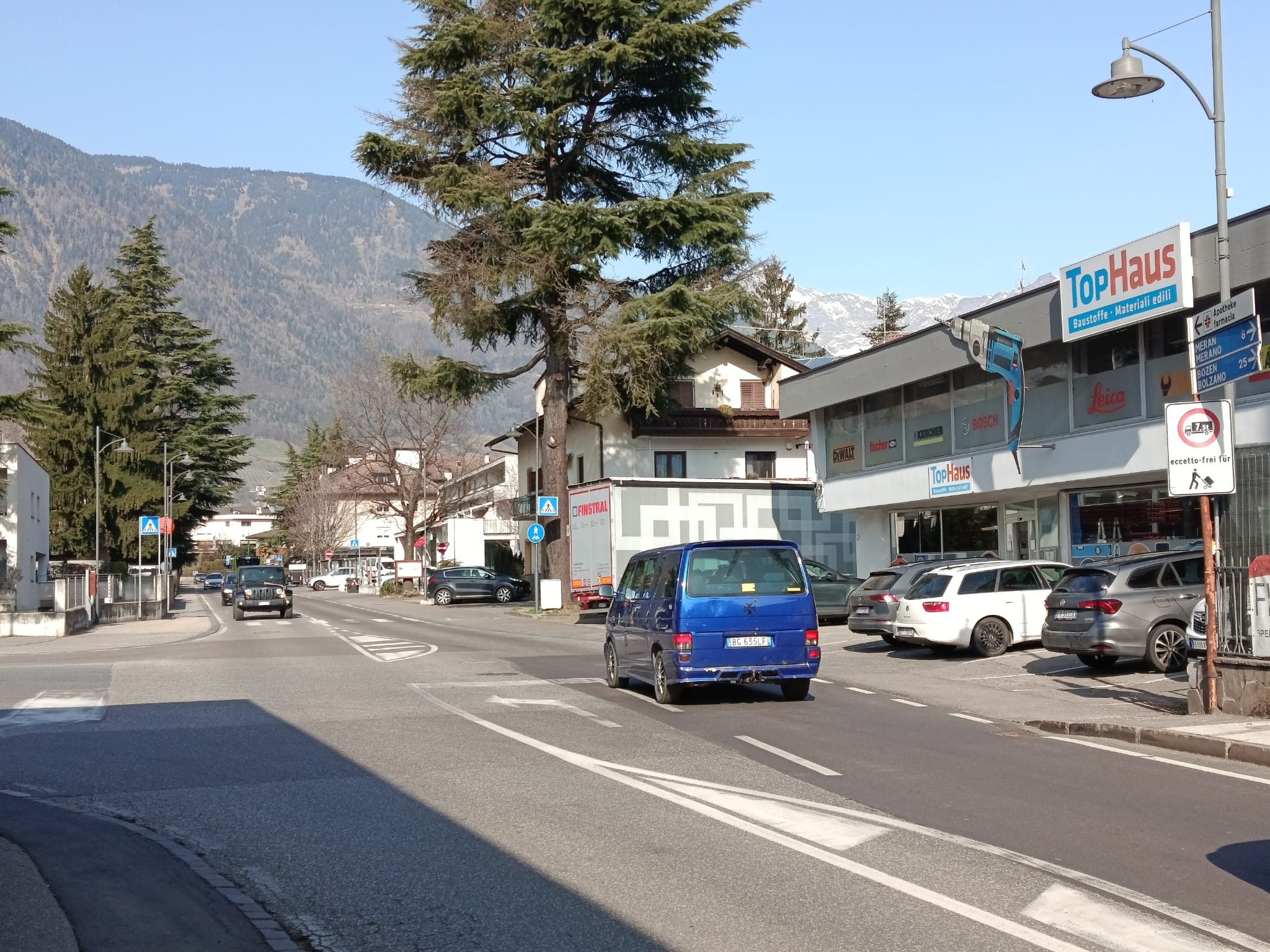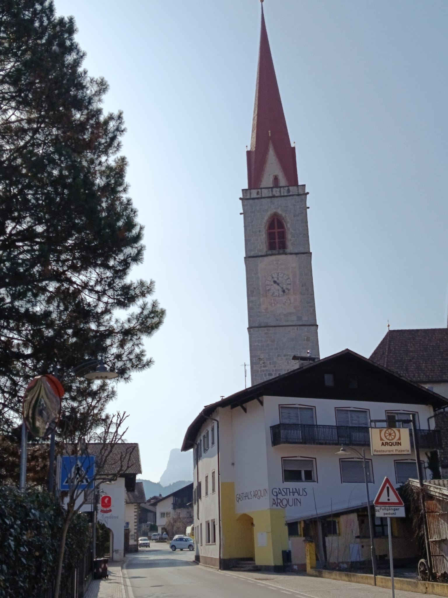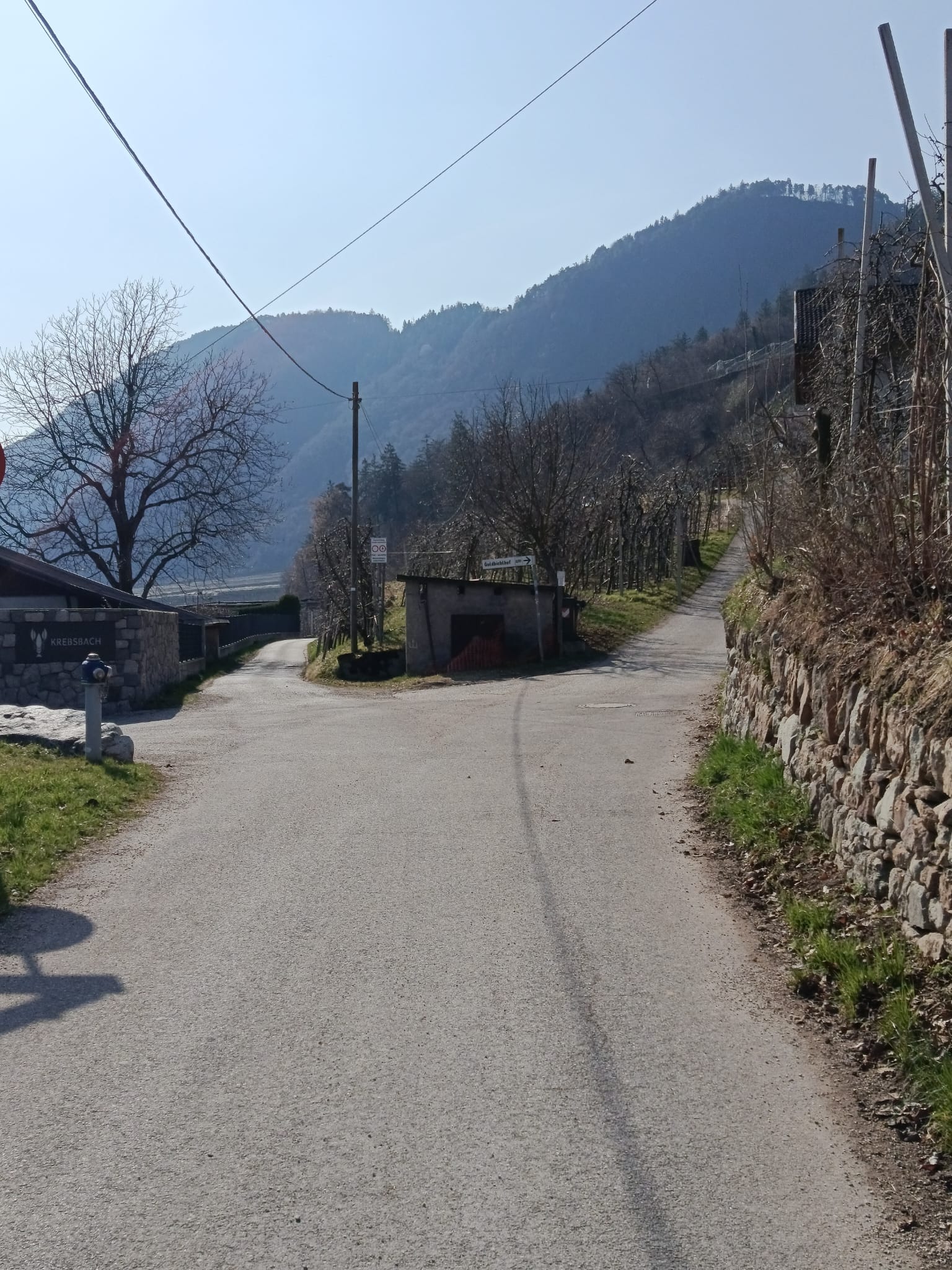 … an der Pfarrkirche vorbei geht es die Weinstraße entlang bis zum Schild "Ortsende Lana".